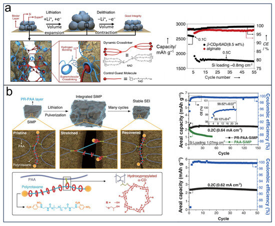 LIBs have shown increasing fatigue in terms of the huge renewable energy demand [45]. Silicon (Si) anodes are one of the most potential candidates which have exceptionally excellent gravimetric capacities (4200 mAh g−1) for meeting this issue. However, the electrode’s structural collapse caused by volume expansion and its significant impact on cycling performance pose obstacles to the advancement of Si anodes [77,78,79]. Polymeric binder has proved to be a key role in maintaining electrode structure and consequently initial capacity [80,81]. Compared with common polymer binders, CDs have stable hydrophobic cavities that can create a host–guest interaction resulting in new binding mechanisms. For instance, Choi and Coskun et al. [80] reported that CDs-based polymer binders by supramolecular crosslinking, hyperbranched features of both β-cyclodextrin polymers (β-CDp), and the supramolecular crosslinker leading to the incorporation of six adamantane units can result in a host–guest interaction causing “dynamic crosslinking” (Figure 3a). The host–guest interactions provide the crosslinking system with the capacity to reversibly restore broken linkages among the polymer chains during the cycling process and to introduce a self-healing effect in addition to maintaining the interactions between Si and the binder, as well as preserving the film integrity throughout the charging and discharging cycles. Reaching a 90% capacity retention after 150 cycles at a rate of 0.5 C with a silicon loading of 0.8 mg cm−2, the excellent cycling performance observed can be attributed to the interaction between β-CDp as the host and guest components. In 2017, the same group proposed a novel concept of groundbreaking elastic crosslinking [82]. In this work, the linkage between poly-(acrylic acid) (PAA) and α-CDs-based pseudo-rotaxanes (PRs) generated a necklace-like and interlocked network marked as PR-PAA (Figure 3b). This strategy makes PR-PAA highly stretchable and elastic, resulting in being able to withstand significant strains (up to 390%) and excellent stress–strain recovery properties, which are superior to PAA. The key factor of the enhanced mechanical strength is owing to the feature that threaded CDs can skillfully slide along the polymer chains.
