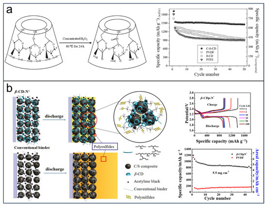 Applications of CDs-based binders in LSBs: (a) The formation of carbonyl-β-cyclodextrin (C-β-CD) and cycle performance. Reprinted with permission from [98]. Copyright Wiley, 2013. (b) Schematic representations of cathode configurations based on hyperbranched binder β-CDp-N+ and cycle performance. Reprinted with permission from [99]. Copyright American Chemical Society, 2015.