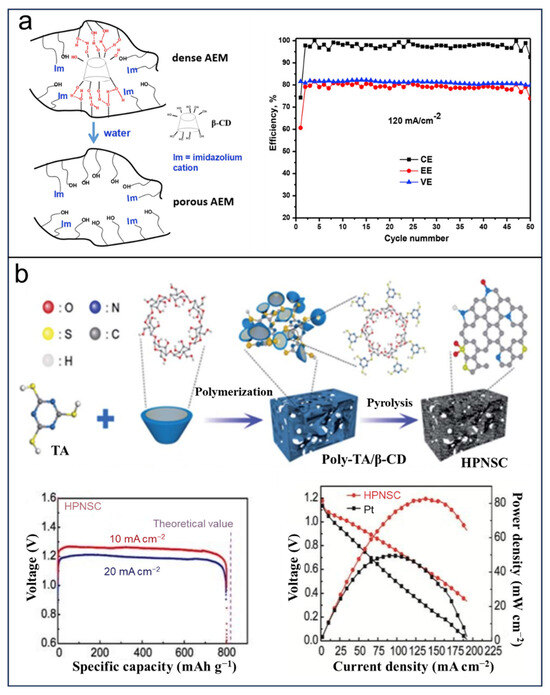 The vanadium redox flow battery (VFB), due to its long life, independent power, and capacity design as well environmental friendliness, has attracted much attention in EES/EEC [102,103,104]. The ion transport membrane plays a key role for suppressing the vanadium ions; permeation, resulting in better performance of the VFB [103,105]. An ideal ion transport membrane should require good conductivity and stability, which have still hindered the commercial application of VFB. Considerable attempts have been dedicated to enhancing the conductivity and stability, leading to the discovery that a substantial number of nanopores within an AEM could potentially address the aforementioned issues. CDs have proven to be great templates for the construction of function materials [89,90,91]. For instance, Ma et al. [106] fabricated a nanoporous anion exchange membrane (AEM), employing β-CD as the template (Figure 8a); because of the abundant hydroxyl groups, β-CD can disperse well in the matrix of HPSf-Im via hydrogen bonding. After the removal of β-CD, nanoporous AEM was obtained, in which the small pore structure can selectively transport protons and anions. The VFB employing such membranes demonstrated a high coulombic efficiency of 99%, and the stable energy efficiency reached 80% at 120 mA cm−2. In 2020, Li et al. [107] reported a strategy that uses a water-insoluble organic ferrocene as the guest and a water-soluble organic hydroxypropyl-β-CD as the host and obtained an electrochemically active electrolyte applied in aqueous organic flow batteries (AOFBs). In this approach, the mitigated degradation of ferrocenium ions leads to an improvement in cycling performance (capacity fading rate reaches 0.0073% per hour).