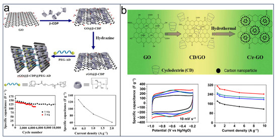 Mechanism of improving electrochemical performance of CDs modified rGO in supercapacitors: (a) prompting the link of rGO layers through host–guest interactions by CDs for increasing the interlayer spacing of rGO sheets (black: C/r-GO−1:1, red: C/r-GO−1:3, blue: C/r-GO−1:5, green: r-GO). Reprinted with permission from [109]. Copyright Elsevier, 2017. (b) Expansion of the interlayer spacing of graphene by anchoring carbonized β-cyclodextrin. Reprinted with permission from [110]. Copyright American Chemical Society, 2016.