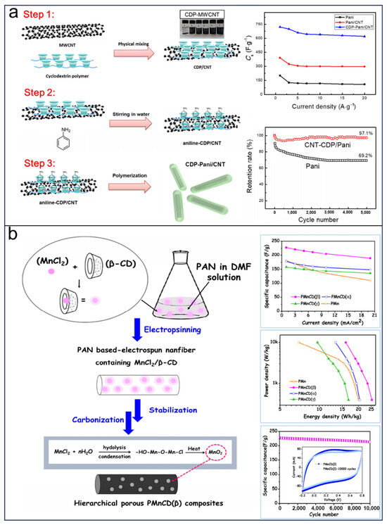 Scheme illustration of CDs used in carbon nanomaterial modifications for better electrochemical performance of supercapacitors: (a) anchoring aniline monomer by guest-recognition resulting in good capacitance. Reprinted with permission from [111]. Copyright Elsevier, 2020. (b) The fabricating process of hierarchical MnO2-embedded CNFs by CDs. Reprinted with permission from [112]. Copyright Elsevier, 2020.