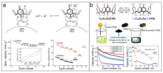 (a) Calix[4]arene grafted on a silica nanoparticle and the proposed redox reaction (top) and cycling performance of CQ grafted on carbon black and SiO2 (bottom). Reprinted with permission from [119]. Copyright Wiley, 2010. (b) Redox insertion/extraction mechanism of C4Q and the preparation of the composites, and the cycling performance of the composites. Reprinted with permission from [120]. Copyright Springer, 2018.