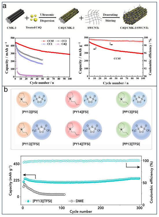 (a) Preparation process and three-dimensional model of C4Q/CMK-3/SWCNTs nanocomposites and cycle performance of C4Q/CMK-3/SWCNTs. Reprinted with permission from [124]. Copyright Royal Society of Chemistry, 2019. (b) Chemical structures of six ionic liquids and cycling stability of C4Q cathode. Reprinted with permission from [126]. Copyright Elsevier, 2019.