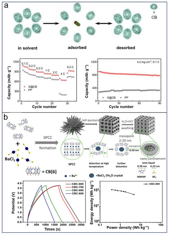 Xie et al. [67] fabricated a separator based on CB[6] that serves as a receptor for the reversible storage/delivery of intractable polysulfides in LSBs. The use of CB[6] can control the undesirable polysulfide shuttle and greatly improve the electrochemical performance of LSBs. The capacity of as-prepared LSBs largely increased from 300 to 900 mAh g−1 with a high sulfur loading (4.2 mg cm−2) (Figure 15a). This work demonstrated that CB[6] could be a promising material used in EES/EEC due to its distinct advantages. In 2021, Cui et al. [137] reported a subnanoporous carbon (CBC) electrode based on CB[6] used in a supercapacitor. As shown in Figure 15b, the energy density of CBC electrodes reaches 117.1 Wh kg−1, and they demonstrate a potential window exceeding 3.8 V when immersed in an MMIMBF4 electrolyte within a two-electrode system. In spite of these successful application of CBs, there are still only a few studies on the application of CB[n] in EES/EEC. It is believed that CB[n] could be extensively explored for wide application in diverse batteries and supercapacitors with further research and the insights of material science.