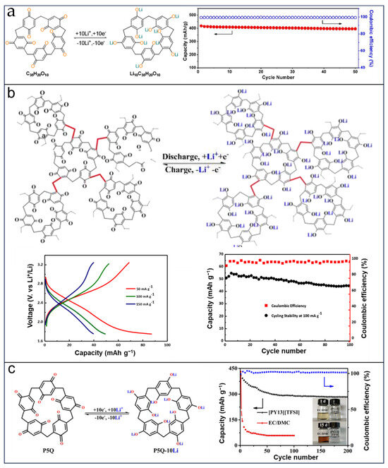 LIBs are still limited by low safety and environmental friendliness for further commercial applications [3,5]. It has been proven that organic electrode materials could be promising candidates for the next generation of friendly batteries owing to the benefits provided by their high theoretical specific capacity, strong designability of molecular structures, good reversibility, high security, and low cost. Calix[n]quinones (CQs) have received much attention because of their redox-active sites. Huang et al. [69] were the first to introduce calix[4]quinone (C4Q) as a cathode material in LIBs, demonstrating a theoretical capacity of 446 mAh g−1 (Figure 11a). In this study, an electrolyte consisting of LiClO4 dissolved in DMSO and loaded with PMA/PEG-based GPE was employed. As shown in Figure 11a, the initial discharge capacity of the quasi-solid-state cells prepared was found to be 422 mAhg−1, accompanied by an average potential of 2.64 V. Furthermore, after undergoing charge–discharge cycles at a rate of 0.2 C for a total of 100 cycles, the remaining capacity was determined to be 379 mAh g−1. However, the batteries based on C4Q were hindered by the poor cycling stability (capacity approximating to 100 mAh g−1 after five cycles at high rate.) owing to the solubility of organic electrolytes and interfacial resistance of the quinone cathode. To address these issues, the same research group synthesized calix[6]quinone (C6Q) composed of six p-quinones linked via methylene groups at the ortho-positions, resulting in 12 redox-active sites of C6Q for the lithiation reaction (Figure 11b) [117]. The lower solubility of C6Q makes it a suitable choice for use as an active electrode material. Consequently, the optimized battery utilizing a plastic crystal electrolyte (PCE) demonstrates a capacity maintenance of 405 mAh g−1 after 500 cycles. Additionally, C6Q possesses the same theoretical specific capacity (Ctheo = 446 mA h g−1) but has a higher molecular weight (MC4Q = 480, MC6Q = 720). Notably, C6Q features a larger cavity that allows for increased penetration of electrolytes, which is advantageous for lithiation/delithiation processes. In a study conducted by Huang et al. [118] in 2020, C6Q was synthesized and applied in LIBs, exhibiting an impressive initial capacity of 423 mA h g−1 at 0.1 C in LIBs and maintaining capacities of 216 and 195 mA h g−1 after undergoing100 and 300 cycles, respectively.
