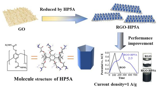 The above approaches also can provide significant insights into the future research of LIBs and SIBs. Besides, pillar[5]quinone can also be used in supercapacitors owing to their high specific capacity and cage structure. Guo et al. [143] fabricated a composite (RGO-HP5A)-based pillar[5]arene containing reduced graphene oxide (RGO) by redox reaction (Figure 17). The water dispersion and stability of the few-layer RGO-HP5A hybrids were observed to be favorable. The nanocomposite fabricated for supercapacitors exhibited a remarkable specific capacitance of 331 F·g−1 at 0.5 A·g−1, along with an exceptional cycling performance attributed to the synergistic effect of RGO and HP5A within this composite.