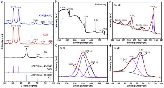 (a) XRD patterns of the as-prepared Cu, CuO, and CuO@Al2O3 products. (b) XPS survey spectrum and high-resolution spectra of (c) Al 2p, (d) Cu 2p, and (e) O 1s of the CuO@Al2O3 composite.