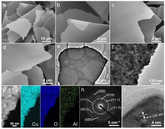 SEM images of the as-prepared (a,b) Cu, (c) CuO, and (d) CuO@Al2O3 flakes. (e,f) TEM images, (g) DF-STEM image and corresponding elemental mapping images of Cu, Al, and O, (h) SAED pattern, and (i) high-resolution TEM image of a single CuO@Al2O3 flake.
