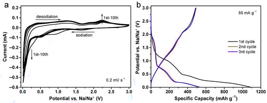 (a) CV curves for the top ten cycles of the CuO@Al2O3 flakes electrode ranging from 0.01 to 3 V versus Na/Na+ at a scan rate of 0.2 mV s−1. (b) Galvanostatic discharge/charge profiles for the first three cycles of the CuO@Al2O3 flakes electrode at a current density of 50 mA g−1.