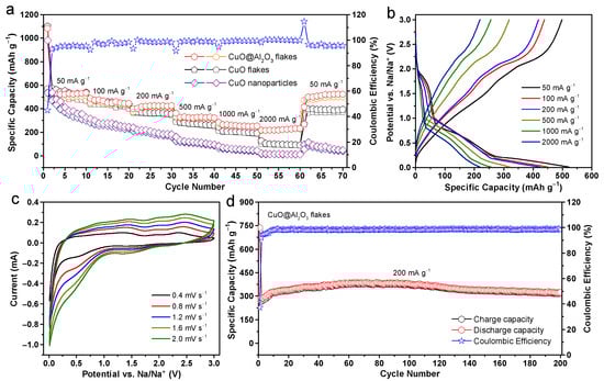 The rate capabilities of the CuO and the CuO@Al2O3 flakes, along with the commercial CuO nanoparticles, were investigated for ten cycles each at various current densities ranging from 50 to 2000 mA g−1. As presented in Figure 4a, the CuO@Al2O3 flakes demonstrate superior specific capacities in comparison to those of the CuO nanoparticles, similar to the CuO flakes without the Al2O3 coating, particularly at high discharge and charge current densities. At a lower current density of 50 mA g−1, the specific charge capacity recorded for the CuO@Al2O3 flakes is 499 mAh g−1, aligning with the performance observed for CuO flakes under identical conditions. The sodium storage performance of the CuO@Al2O3 flakes is notably enhanced as the current density for discharge and charge increases to 100, 200, 500, and 1000 mA g−1. At these current densities, the CuO@Al2O3 flakes exhibit specific capacities of 439, 419, 319, and 257 mAh g−1, respectively. In contrast, under the respective current densities, the pure CuO flakes demonstrate significantly lower specific capacities of 436, 358, 270, and 202 mAh g−1, respectively. Even at an extremely high current density of 2000 mA g−1, the CuO@Al2O3 flakes maintain a high specific capacity of 220 mAh g−1 over 55 cycles, significantly outperforming the CuO flakes and CuO nanoparticles, which only exhibit capacities of 96 and 13 mAh g−1, respectively. Remarkably, upon reducing the current density back to 50 mA g−1 and subjecting it to an additional 10 cycles of continuous cycling, the CuO@Al2O3 flakes electrode exhibits a remarkable discharge capacity of 525 mAh g−1, corresponding to about 98.7% of the discharge capacity in the second cycle and over 95.8% Coulombic efficiency after 70 cycles. Meanwhile, the CuO flakes electrode exhibits gradual capacity fading, retaining only about 375 mAh g−1 under the same testing conditions. Overall, the sodium storage capability of the CuO flakes is marginally inferior to that of the CuO@Al2O3 flakes but significantly surpasses that of the CuO nanoparticles. This improvement suggests that the ALD Al2O3 coating enhances the rate capability and cycling performance of the CuO@Al2O3 flakes, enabling them to sustain high-current operation more effectively.