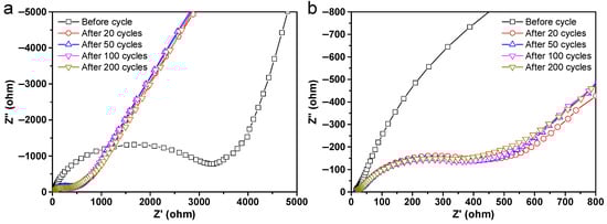 (a) Nyquist plots and (b) enlarged Nyquist plots of the CuO@Al2O3 flakes electrode before cycling and after 20, 50, 100, and 200 cycles.