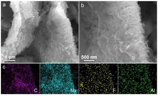 SEM images at (a) high and (b) low magnification, along with (c) the corresponding elemental mapping images for C, Na, F, and Al of the CuO@Al2O3 flakes electrode after undergoing 200 discharge/charge cycles at a current density of 200 mA g−1.