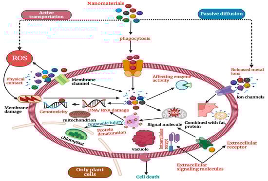 The variance in NP uptake efficiency is further influenced by changes in plant species and genotypes, highlighting the complex interplay between plant-specific features and NP properties []. By affecting root architecture and physiology, environmental factors such as soil pH, nutrient availability, and organic matter content can significantly regulate NP uptake. NPs in soil can produce toxic effects at the levels of genes, cells, individual organisms, and communities []. As shown in Figure 1, NPs can enter cells through active transport and phagocytosis to induce oxidative stress, affect enzyme activity, damage DNA/RNA, and, in other ways, produce cell toxicity. NPs that do not enter cells can cause membrane damage through physical contact, and metal ions released by metal NPs enter cells mainly through passive diffusion to produce toxic effects []. It is believed that ROS production is the main mechanism leading to cell damage. Nanoparticles can stimulate the ground-state oxygen in organisms to produce a large number of ROS, such as hydroxyl radical (·OH), singlet oxygen (1O2), (O2−1), hydrogen peroxide (H2O2), etc. []. ·OH has a strong oxidation capacity with an oxidation potential of 2.8 V. It can irreversibly destroy many biological macromolecules, including sugars, fats, and proteins []. 1O2 can oxidize and damage a variety of biological components and destroy organisms. O2−1 is unstable and can be converted into •OH and 1O2 in biological systems []. It can cause an imbalance of the REDOX state in the cell, resulting in oxidative damage to the organism, such as cell inflammation and death []. A comprehensive understanding of NP absorption mechanisms that goes beyond passive diffusion and includes endocytic pathways is required due to the complicated interactions between these components [].