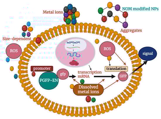 Beginning with cellular uptake, which is controlled by NP size, shape, surface charge, and composition, interactions between NPs and biological systems begin. These physicochemical characteristics have an important role in determining cellular internalization mechanisms, including endocytosis and direct penetration, according to recent studies. Electrostatic interactions may be important because they show that positively charged silver nanoparticles have increased cellular absorption compared with their negatively charged counterparts []. Numerous investigations have documented the genome toxicity caused by NP, which includes mutations, chromosomal abnormalities, and DNA strand breaks. These consequences may result from ROS-related secondary effects or from physical damage caused by direct interactions between NPs and DNA. It was revealed that the production of ROS and subsequent activation of DNA repair pathways by gold nanoparticles could cause DNA damage []. The key methods for toxicological appraisal of nanoparticles, as described in the search results, include a combination of in vitro and in vivo approaches. In vitro studies using cell lines are crucial for assessing the acute damaging effects of nanoparticles in specific cellular environments [,]. Genotoxicity testing is also used to evaluate the potential of nanoparticles to cause genetic damage such as mutations or chromosomal aberrations. Calculating the No Observed Adverse Effect Level (NOAEL) is an important step in nanoparticle toxicity testing, which helps determine the safe dose levels for further studies [,]. However, extrapolation of cell-based data into in vivo scenarios is problematic due to the extreme conditions in vitro, so in vivo testing remains crucial for assessing biodistribution, bioaccumulation, and systemic toxicity []. To fully investigate the toxicity and potential risk of a particular nanomaterial, a combination of multiple in vitro tests is required. Table 2 lists the toxicity of several typical nanoparticles that have been evaluated using different biological assessment models. The toxicity of nanoparticles to organisms mainly includes the following four aspects: (1) nanoparticles with nanoscale are easy to cross the cell membrane into the cell, easy to damage the cell membrane and interfere with the physiological activity in the cell; (2) Nanoparticles have high activity, and the generated reactive oxygen species (ROS) on the one hand is easy to damage the cell membrane, destroy the permeability of the cell, hinder the exchange of materials between the cell and the outside world, and easily cause protein denaturation; On the other hand, ROS produced by nanoparticles can stimulate the oxidative stress pathway in cells, resulting in cell damage []; (3) Nano-oxygen is applied to some nanoparticles that can dissolve metal ions (such as programmed copper, cadmium selenide, etc.), and the dissolved metal ions also enhance the toxicity of nanoparticles in terms of nanoscale. Taking the study on the toxicity of particles to particles in Figure 2 as an example, the toxicity of Escherichia coli nanoparticles can be divided into the following aspects: First, the nanoparticles have a large specific surface area, which can fully interact with the cell membrane of E.coli and destroy the permeability of cells, thus causing cytotoxicity; Secondly, ROS produced by nanoparticles themselves and possibly dissolved metal ions can cause toxicity in E. coli. Moreover, nanoparticles entering cells can stimulate oxidative pathways in cells, resulting in oxidative stress behavior, interfering with protein expression in cells, or post-transcriptional translation []. Finally, nanoparticles entering the cell can interact with proteins and their DNA in the cell, causing them to lose certain functions []. In previous toxicity studies, a single biological model was typically used to assess or study the toxicity of nanoparticles. Commonly used model organisms have included bacteria [], algae [], fish [], zooplankton [], mammalian cell lines [], and so on. Studies have shown that nanoscale particles can seriously impair the physiological activities of cells, subcells, and proteins and even lead to cell death. The main hazards include entry and deposition in the relevant cells (nerve cells, hepatocytes, etc.) [], protein degeneration and reduced enzyme activity [], and genotoxicity []. DNA mutation and cell membrane damage [] Oxidative stress [] and mitochondrial damage [] affect the expression of functional proteins [] and immunity [].