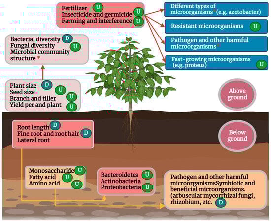 Effects of domestication on microbiome community composition and diversity of crops (U) indicate significant increase and (D) decrease, respectively; (*) indicates a significant difference.