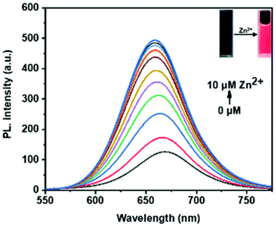 Fluorescence changes in probe 1 response to Zn2+ (0–10 μM) in HEPES buffer solution (pH = 7.4) with DMSO (v/v = 1:1), λex = 475 nm, λem = 660 nm. Reproduced with permission from Ref. [48]. Copyright 2021, The Royal Society of Chemistry.
