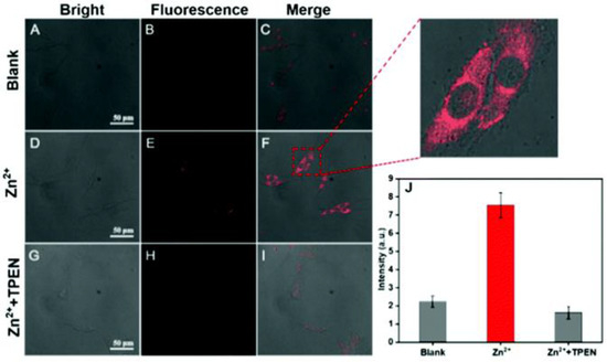 Confocal imaging in PC12 cells. (A–C) PC12 cells incubated with probe 1 (10 μM) for 30 min. (D–F) PC12 cells incubated with Zn2+ (10 μM) for 10 min, followed by incubation with probe 1 (10 μM) for 30 min. (G–I) PC12 cells incubated with TPEN (10 μM) for 10 min and with Zn2+ (10 μM) for 10 min, followed by incubation with probe 1 (10 μM) for 30 min. λex = 561 nm and obtained at 600–700 nm. (J) Average intensity of PC12 cells. Error bars express the standard deviation (±S.D.) with n ≥ 3. Reproduced with permission from Ref. [48]. Copyright 2021, The Royal Society of Chemistry.