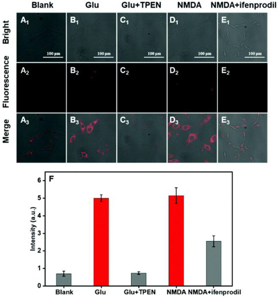 The detection of endogenous Zn2+ in PC12 cells with probe 1 was performed by the stimulation of glutamate. A high concentration of glutamate induces oxidative stress in the nervous system [49], followed by an increase in Zn2+ in nerve cells [50]. As shown in Figure 3, the glutamate-stimulated PC12 cells exhibited red fluorescence due to the increase in intracellular Zn2+. The red fluorescence was completely suppressed when TPEN was added. Further application of probe 1 to monitor Zn2+ in PC12 cells during depression was conducted by incubation of N-methyl-D-aspartic acid (NMDA) receptors, which are postsynaptic targets for releasing Zn2+. In comparison with the control group, the PC12 cells, preincubated with NMDA, a specific agonist for the NMDA receptor, exhibited apparent red fluorescence (D2 and D3). The red fluorescence was, however, decreased by the addition of ifenprodil tartrate, a specific NMDA receptor antagonist (E2 and E3). The results suggest that the generation of Zn2+ is correlated with the over-activation of the NMDA receptor, and probe 1 can monitor variations in Zn2+ in real time during depression.