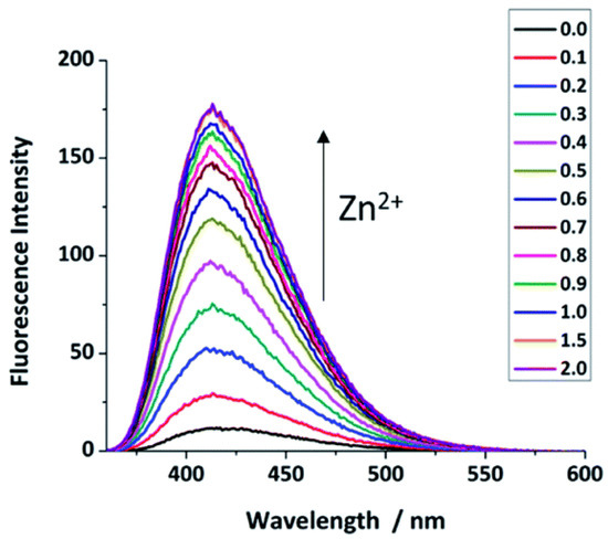 Fluorescence changes in probe 2 response to Zn2+ (0–2.0 μM) in HEPES buffer solution (pH = 7.4) with 1% DMSO, λex = 346 nm, λem = 414 nm. Reproduced with permission from Ref. [56]. Copyright 2019, The Royal Society of Chemistry.