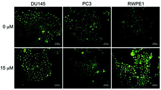 Fluorescence microscope images of cancerous prostate cells (PC3 and DU145) and normal human prostate epithelial cells (RWPE1) incubated with probe 3 (1 µM, 24 h) in the absence and presence of an exogenous Zn2+ (15 µM). Reproduced with permission from Ref. [57]. Copyright 2019, The Royal Society of Chemistry.