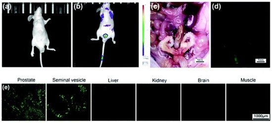 Representative in vivo imaging of tumor-free male BALB/c nude mice before injection (a) and after tail-vein injection (b) of probe 3 (500 µg per mouse, 5 mice per set). The treated mouse was sacrificed and dissected. The excised prostate and seminal vesicles revealed bright green fluorescence, while other viscera and skeletal muscles remained dark (c,d). Ex vivo fluorescence imaging of the prostate, seminal vesicles, liver, kidney, brain, and adjacent muscle tissue obtained from the mouse injected with probe 3 (e). Reproduced with permission from Ref. [57]. Copyright 2019, The Royal Society of Chemistry.