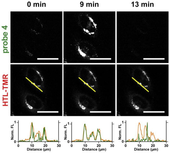 Confocal microscopy images of probe 4 (0.25 µM) and HTL-TMR (5.0 nM) at 0 min (steady-state), 9 min (saturation), and 13 min (depletion). The line profiles indicate the fluorescence intensities of probe 4 (green) and HTL-TMR (orange), measured along the yellow lines in the HTL-TMR images. Scale bar: 30 mm. Zn2+/pyrithione (ZPT, 40 µM/2 µM, at 2 min) and TPEN (80 µM, at 10 min) were added to increase and decrease intracellular Zn2+. Reproduced with permission from Ref. [58]. Copyright 2020, Elsevier.