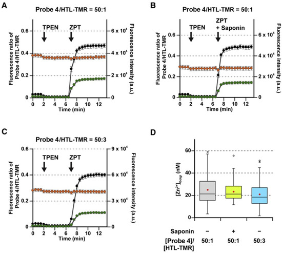 The concentration of labile Zn2+ varies in different environments. Labile Zn2+ in serum or plasma is, for example, approximately 1−10 μM [18,19], while in the cytosol, labile Zn2+ is controlled between 100 pM and 1 nM [20,21,22]. A deficiency or excess of Zn2+ can cause diseases, and some diseases such as compromised immunity, impaired cognition, and abnormal brain development are believed to be related to Zn2+ deficiency [23,24]. On the other hand, Zn2+ overabundance leads to cytotoxicity [25,26,27], gastrointestinal discomfort, and disrupted cholesterol metabolism. Moreover, the disruption of Zn2+ homeostasis can potentially disturb other transition metal ions’ homeostasis [28]. Therefore, quantitative clarification of Zn2+ dynamics at the organelle level can provide fundamental information to better understand the physiological roles of Zn2+ in individual organelles and assist in elucidating the networks of Zn2+ in cells [29,30].