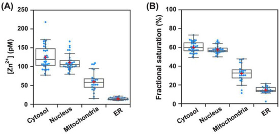 Quantitative mapping of intracellular Zn2+ using probe 5 (A) and fractional saturation of probe 5 at the steady state (B) in various organelles. Red plus symbols represent the mean values. Reproduced with permission from Ref. [63]. Copyright 2022, American Chemical Society.