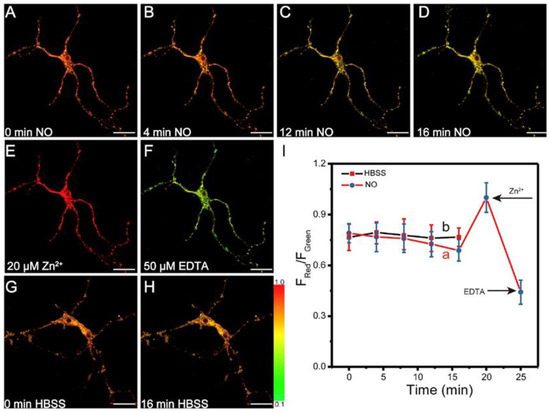In vitro imaging with probe 7 was evaluated using mouse cortical neurons as a model system by TP excitation at 750 nm. Two emission channels, Fgreen (380–470 nm) and Fred (470–650 nm), were employed for recording, and endogenous Zn2+ was obtained by NO-inducing metallothioneins [72]. As shown in Figure 15A–D, the color of the images changed from orange to yellow after the cells were incubated with NO for 16 min, accompanied by the decrease in fluorescent intensity ratio Fred/Fgreen from 0.79 ± 0.06 to 0.68 ± 0.07, which resulted from the decrease in the concentration of Zn2+ released from the mouse cortical neurons due to the decrease in NO. The control experiments demonstrated that probe 7 exhibited significant reversibility and good photostability. The former was proven by subsequently treated with Zn2+/pyrithione followed with EDTA (chelator for Zn2+) (Figure 15E,F), the latter by irradiation of probe 7 in HBSS buffer for 16 min (Figure 15G,H).
