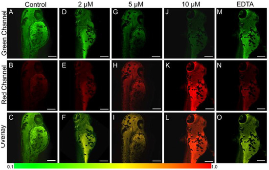 TP fluorescence images of 1-day-old larval zebrafish treated with 5 μM probe 7 in different concentrations of Zn2+: (A–C) 0 μM, (D–F) 2 μM, (G–I) 5 μM, (J–L) 10 μM, and then incubated with 20 μM EDTA (M–O). Green channel (A,D,G,J,M) obtained from 380–470 nm, red channel (B,E,H,K,O) obtained from 470–650 nm, overlay channel (C,F,I,L,O) represented Fred/Fgreen; scale bars: 120 μm. Reproduced with permission from Ref. [71]. Copyright 2020, Elsevier.