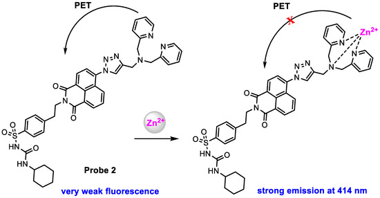 For turn-on probes [42,43,44], most operate on the principle of photo-induced electron transfer (PET) between the fluorophore and Zn2+. In the absence of Zn2+, the fluorophore is quenched by PET from the electron-rich chelating group. Upon binding Zn2+, the PET between the chelating moiety and the fluorophore is disrupted, leading to an increase in fluorescence emission. Manipulation of the fluorophore and binding motif platform can tune the efficiency of PET; therefore, the magnitude of fluorescence changes with Zn2+ binding.