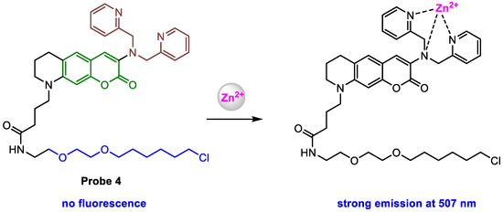 Kowada and co-workers [58] employed HaloTag technology [59], a protein-labeling technology, to localize fluorescent probes to a specific subcellular compartment [60,61,62], to target probe 4 (Scheme 5) into the Golgi apparatus. Probe 4 was constructed with four parts: a fluorophore (green color), a Zn2+ chelator (brown color), a HaloTag ligand (blue color), and a linker (black color). Probe 4 showed almost no fluorescence before the response to Zn2+, but a strong fluorescence (λem = 507 nm, ϕf = 0.52) was obtained upon the addition of the Zn2+. Fluorometry revealed that probe 4 exhibited Zn2+-dependent enhancement of fluorescence. The control experiments suggested that probe 4 displayed high selectivity to the detection of labile Zn2+ without interference from other metal ions. In addition, probe 4, together with its Zn2+-complex, exhibited almost constant fluorescence intensity in the pH range from 6 to 8.