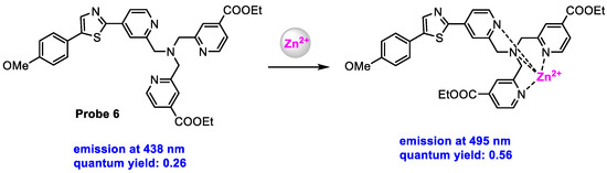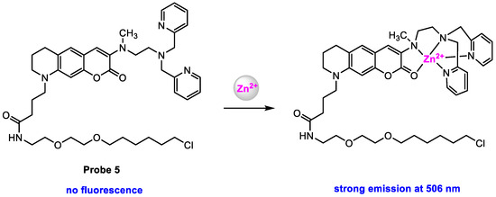 To obtain the quantification of Zn2+ in various organelles, the same group [63] modified probe 4 with a higher-affinity Zn2+-binding motif to increase the Zn2+ affinity of the probe. Probe 5 (Scheme 6) was designed to increase the Zn2+ affinity by increasing the coordination number of the chelator moiety. Compared to probe 4 (dissociation constant: Kd = 240 nM), probe 5 exhibited a much higher affinity for Zn2+ (Kd = 0.16 nM) in HEPES buffer (pH = 7.4).