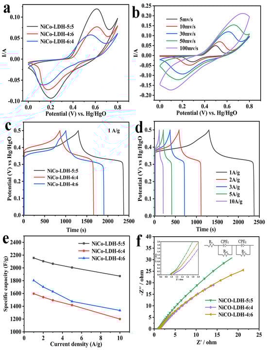 (a) Comparison of CV curves at 30 mV/s; (b) CV curves of NiCo-LDH-5:5 with varied scan rates; (c) GCD curves of NiCo-LDH-5:5, NiCo-LDH-4:6, and NiCo-LDH-6:4 at 1 A/g; (d) GCD curves of NiCo-LDH-5:5 at different current densities; (e) specific capacitance of NiCo-LDH-5:5, NiCo-LDH-4:6, and NiCo-LDH-6:4 at different current densities; (f) Nyquist plots of NiCo-LDH-5:5, NiCo-LDH-4:6, and NiCo-LDH-6:4.