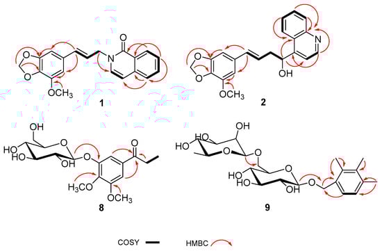 The key HMBC and 1H-1H COSY correlations of compounds 1–2 and 8–9.