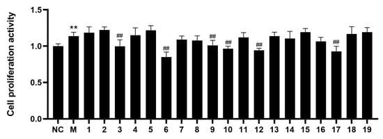 The isolates 1–19 were screened for their inhibitory effects on PASMCs’ abnormal proliferation induced by hypoxia in vitro. As shown in Figure 4, compared with the normal (NC) group, the proliferation rate of PASMCs in the model (M) group was significantly increased (p < 0.01). Compared with the M group, the proliferation rates of the compounds 3, 6, 9–10, 12, and 17 groups were significantly decreased (p < 0.01), which indicated that compounds 3, 6, 9–10, 12, and 17 can significantly inhibit the abnormal proliferation of PASMCs at 5 μM. Then, these cells were treated with the compounds (3, 6, 9–10, 12, and 17) with different concentrations (1, 2.5, 5, 10, 20, 50, and 100 μM). Compounds 3, 6, 9–10, 12, and 17 suppressed the abnormal proliferation of PASMCs, with IC50 values of 56.3 ± 0.5, 10.7 ± 0.65, 57.1 ± 1.1, 44.0 ± 0.75, 41.5 ± 0.87, and 35.3 ± 0.42 μM, respectively. Notably, the comparison of compounds 8 and 12 showed that the methoxy fragment connected to C-8 may be responsible for the inhibition. Additionally, compounds 9 and 10 exhibited an inhibitory effect in contrast to compounds 14 and 15, which might be attributed to the presence of a 2,3,4-trimethylphenyl group.
