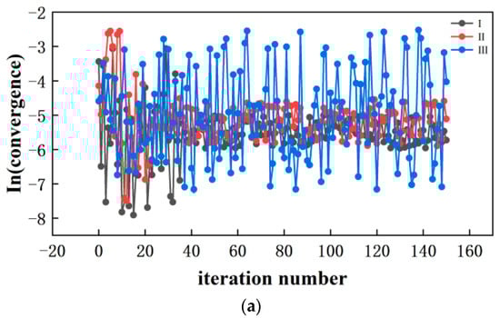 For the trajectories from the simulation times of 3 × 10 ns in 21 independent spaces, the average sampling and K-means clustering of OPs for bond orientation and relative orientation were performed. According to the definition of the convergence of the string shown by the literature [57], the values of convergence were calculated, and for clarity, the logarithmic values of convergence were determined with ln(convergence), as shown in Figure 2. I, II, and III represent the convergence of the bond orientation and relative orientation OPs obtained through K-means clustering sampling, and the relative orientation OPs obtained from the average sampling, respectively. It was found that for the bond orientation OPs, the ln(Convergence) values are large (−4.0~0.0). Those close to 0.0 may be caused by the “dimension explosion” of the OPs. For the relative orientation OPs with the average sampling, there is no convergence even after 150 iterations. The average sampling has significant dispersion and uncertainty. In this case, the simulation from a sampling space may cover adjacent spaces along the transition path, leading to an uneven initial string connecting adjacent points. As is well known, for the non-smooth string, there are always some independent sampling spaces that are not perpendicular to the current string, which causes the restricted samples around each representative point to interfere with each other and interweave together, leading to confusion in the evolution direction of the string. A smooth string means that these intermediate states can continuously change from one to the other, and the purpose of smoothing the string is to eliminate irrelevant information. It is found from I and II in Figure 2 that after the K-means clustering enhanced sampling, the strings of two OPs converge after 14 and 11 iterations, respectively.
