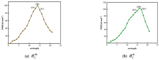 Curve of PMF with arc length ((a,b): PMF with and for the polymorphic transformation without electric field, respectively; (c–e): PMF with for the polymorphic transformation from o-TNT to m-TNT under the external electric fields with the strength of 51.40 × 108 V/m along the a-, b- and c-axis, respectively; (f–h): PMF with for the polymorphic transformation from o-TNT to m-TNT under the external electric fields with the strength of 51.40 × 108 V/m along the a-, b- and c-axis, respectively).