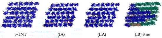 In order to gain further mechanistic insights into the polymorphic transformation, the local OPs of TNT were shown for the key snapshots at the points of the PFM curve along the trajectory going from o-TNT to m-TNT (see Figure 4). The molecules that can be regarded as o-TNT were labeled in blue with the values of > ~200 or > ~220, and the green molecules were regarded as m-TNT with the values of < ~130 or < ~150, whereas the wireframe molecules in red formed in the interface between the two polymorphs with the values in the range of 130~200 or 150~220 for and , respectively. (IB) and (IIB) represent the phase transition state, as the labels in Figure 3.