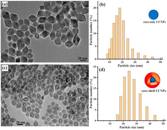 Experimentally, UCNPs with core and core–shell structures were hydrothermally synthesized following a synthesis procedure previously reported in [26] and detailed in the Materials and Methods. To visualize the size and shape of the produced core and core–shell UCNPs, a few drops of each sample were placed on a transmission electron microscope (TEM) with a carbon-coated copper grid. Figure 1a shows well-dispersed core UCNPs with an average size of 18 nm. The particle size of the synthesized core UCNPs was then confirmed to be 18 nm using a dynamic light scattering machine (DLS), as illustrated in Figure 1b. Figure 1c shows the uniform structure of the synthesized UCNP core–shell nanocrystals, with an average size of 25 nm. The average size of the core–shell UCNPs was also confirmed with DLS to be 25 nm, as shown in Figure 1d.