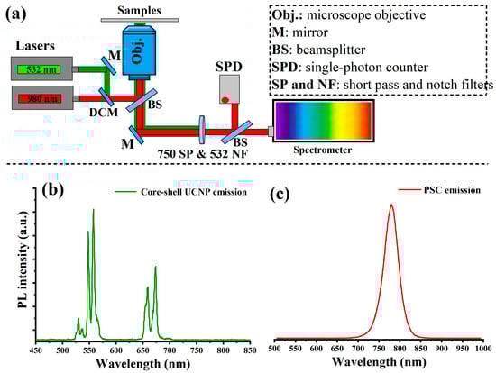 (a) Schematic illustration of a home-made confocal microscope designed and equipped with a green 532 nm laser and a near-infrared 980 nm laser for photoluminescence (PL) measurement of the PSC layers integrated with UCNPs in a core–shell structure. The designed optical microscope is equipped with an imaging system, lasers, a photon counter, and a custom-made spectrometer. (b) The UCNP emission spectrum measured directly from the core–shell UCNP layer (the particles that were integrated into the PSC fabrication), showing green emission peaks centered at 527 nm and 550 nm as well as a weak red emission peak at 650–680 nm. (c) The optical emission from the perovskite material under green (532 nm) excitation.