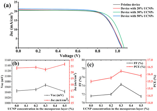 Performance parameters of the fabricated PSCs integrated with UCNPs in a core–shell structure. (a) presents the current–voltage (J-V) characteristic curves of fabricated PSCs measured under AM 1.5 G solar stimulation, comparing cells with varying amounts of UCNPs integrated into their mesoporous layers to those without UCNPs. The curves illustrate the impact of UCNPs on the electrical performance of the solar cells. (b,c) present key performance parameters as functions of the UCNP content. They display how the open-circuit voltage (Voc), short-circuit current density (Jsc), fill factor (FF), and power conversion efficiency (PCE) of the PSCs varied with different concentrations of UCNPs within their mesoporous layers.