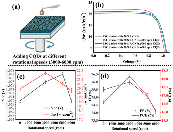 Performance parameters of the fabricated PSCs integrated with 30% UCNPs and CQDs at different spin coating speeds. (a) presents an illustration of adding CQDs on top of the perovskite layer of the fabricated PSCs at different spin coating speeds. (b) presents the current–voltage (J-V) characteristic curves of fabricated PSCs measured under AM 1.5 G solar stimulation, comparing cells with varying amounts of UCNPs integrated into their mesoporous layers to those without UCNPs. The curves illustrate the impact of UCNPs on the electrical performance of the solar cells. (c,d) present key performance parameters as functions of the UCNP content. They display how the open-circuit voltage (Voc), short-circuit current density (Jsc), fill factor (FF), and power conversion efficiency (PCE) of the PSCs varied with different concentrations of UCNPs within their mesoporous layers.
