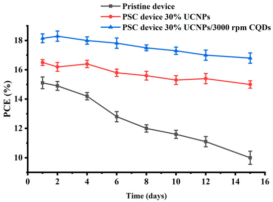 Finally, to assess the stability of both UCNP- and CQD-modified perovskite solar cells (PSCs) under conditions with unregulated humidity, a thorough investigation was conducted over several days, as shown in Figure 6. This study compared the stability of three types of fabricated devices: PSC devices containing 30% UCNPs and 3000 rpm CQDs, PSC devices with 30% UCNPs only, and pristine devices. Performance was monitored over time, revealing notable differences. Remarkably, devices integrated with both UCNPs and CQDs exhibited superior stability compared to their pristine counterparts. Specifically, the PCE of the PSC devices with 30% UCNPs and CQD passivation at 3000 rpm maintained 92.5% of its initial value, while the pristine devices saw a decrease to 66% efficiency. This enhanced stability is attributed to the UCNPs’ ability to convert near-infrared light to visible light, improving electron transport, and the CQDs’ role in passivating grain boundaries, reducing defect densities in the perovskite film [15,24,25]. Additionally, CQDs interacted with uncoordinated lead ions in grain boundaries, mitigating moisture-induced degradation.