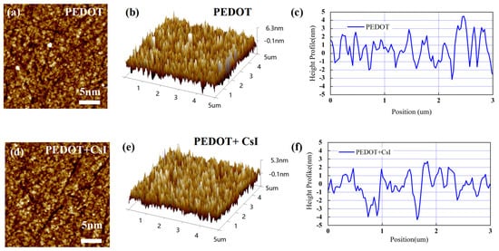 AFM morphology images and corresponding height profiles of PEDOT and PEDOT + CsI films: (a,d) two-dimensional topography, (b,e) three-dimensional topography, and (c,f) height profiles.
