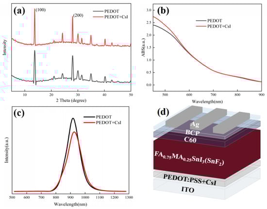 (a) XRD spectra of perovskite films deposited on PEDOT and PEDOT + CsI films, (b) UV-vis absorption spectra of perovskite films deposited on PEDOT and PEDOT + CsI films, (c) PL spectra of perovskite films deposited on PEDOT and PEDOT + CsI films, and (d) device configuration of Sn-based PSCs with CsI.