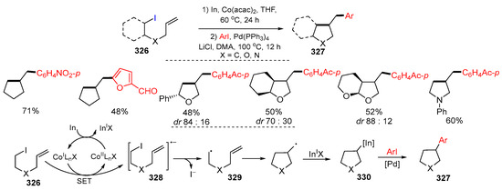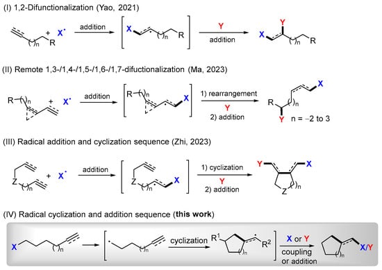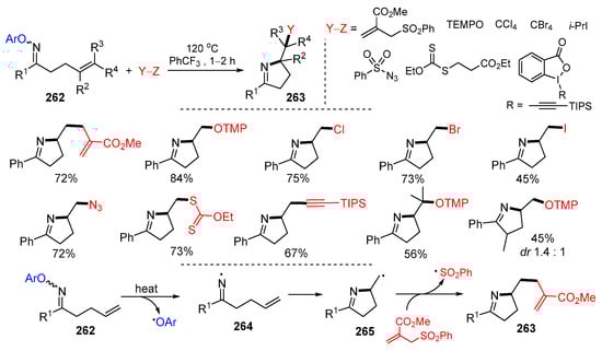Feasible radical transformations including addition, cyclization, coupling, atom or group transfer, rearrangement, and fragmentation reactions have made radical reactions a powerful tool for making carbon-carbon and carbon-heteroatom bonds [1,2]. The recent developments in radical cyclative functionalization [3,4], radical-enabled bicyclization [5], photoredox reactions [6,7,8], mechanoredox reactions [9], electrochemical reactions [10], and transition metal-assisted radical reactions [11,12,13,14] have empowered the utility of synthetic radicals. Radical reactions being performed in a cascade sequence for the assembling of complex molecular scaffolds with multiple functional groups in regio- and diastereoselective manners is a unique feature. In addition to the cascade reaction sequence, the final radical intermediates could be trapped by radicals or other active species to introduce new functional groups. This process makes the radical reactions even more attractive.