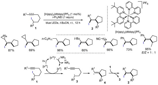 The iodine atom is a good transfer group for ATRC. In 2017, Martin and coworkers developed a visible light-promoted ATRC reaction of unactivated alkyl iodides for the synthesis of (iodomethylene)cyclopentanes. The reaction was carried out using alkyl iodides 1 in the presence of [Ir(ppy)2(dtbbpy)]PF6 and i-Pr2NEt in t-BuCN under blue LEDs irradiation at room temperature for 12 h to give products (iodomethylene)cyclopentanes 2 in good to excellent yields (Scheme 4) [29]. The suggested reaction mechanism indicates that radicals 3 generated via a single electron transfer (SET) process of alkyl iodides 1 with [IrII] undergo a 5-exo cyclization to give radicals 4 and then lead to the formation of products 2 after trapping the iodine radical from alkyl iodides 1.