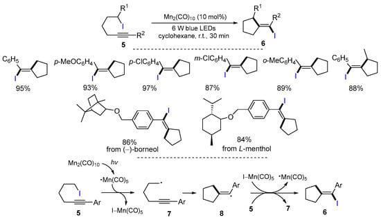 In 2019, Zhang and coworkers reported a visible-light-induced ATRC reaction of alkyl iodides for the synthesis of cyclic alkenyl iodides (Scheme 5) [30]. The Mn2(CO)10-catalyzed reaction of alkyl iodides 5 under the irradiation of blue LEDs in cyclohexane at room temperature gave products 6 in moderate to excellent yields. The reactions of natural products such as (−)-borneol and L-menthol also afforded the corresponding products in excellent yields. The proposed reaction mechanism suggested that the Mn(CO)5 radical is generated by the photo-induced Mn−Mn bond homolysis of Mn2(CO)10. The reaction of alkyl iodides 5 with the Mn(CO)5 radical affords radicals 7 which undergo 5-exo cyclization to form radicals 8 followed by iodine atom transfer from 5 to give products 6.