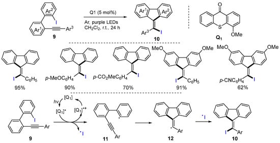 Other than iodoalkyl group, iodoaryl groups are also good for ATRC. Guo and coworkers, in 2019, introduced a photo-induced ATRC reaction of aryl iodide for the synthesis of iodine-substituted fluorene derivatives. The reaction of aryl iodide 9 with photosensitizer thioxanthone (Q1) under the irradiation of purple LEDs in CH2Cl2 at room temperature gave products 10 in good to excellent yields (Scheme 6) [31]. The reaction process involves the formation of triplet 9 via SET reduction in the photoexcited state [Q1]* species to [Q1]•+. The Ar–I bond cleavage of triplet 9 produces aryl radicals 11 and the iodine radical. Subsequential radical cyclization to form 12 followed by the iodine radical coupling affords products 10.